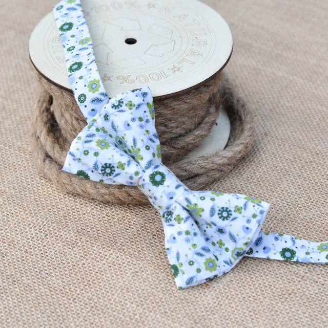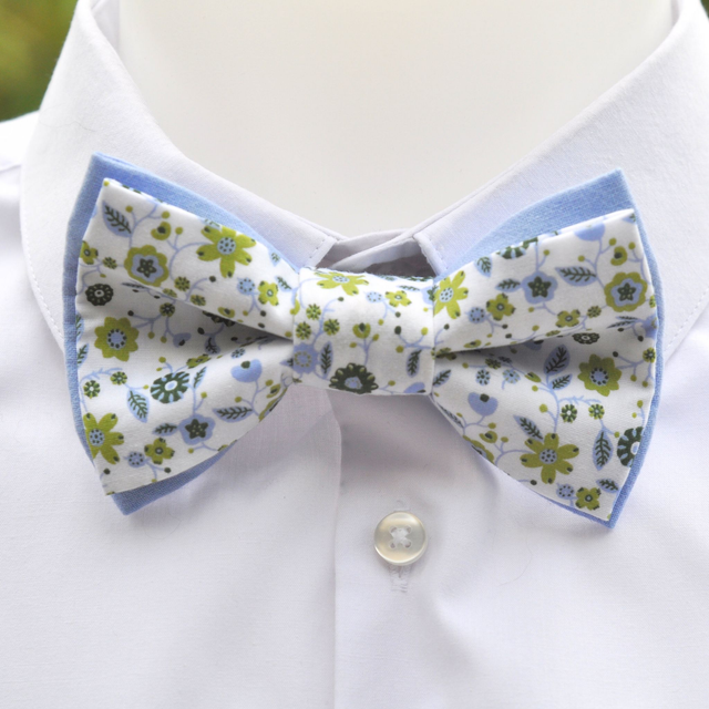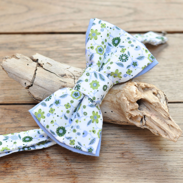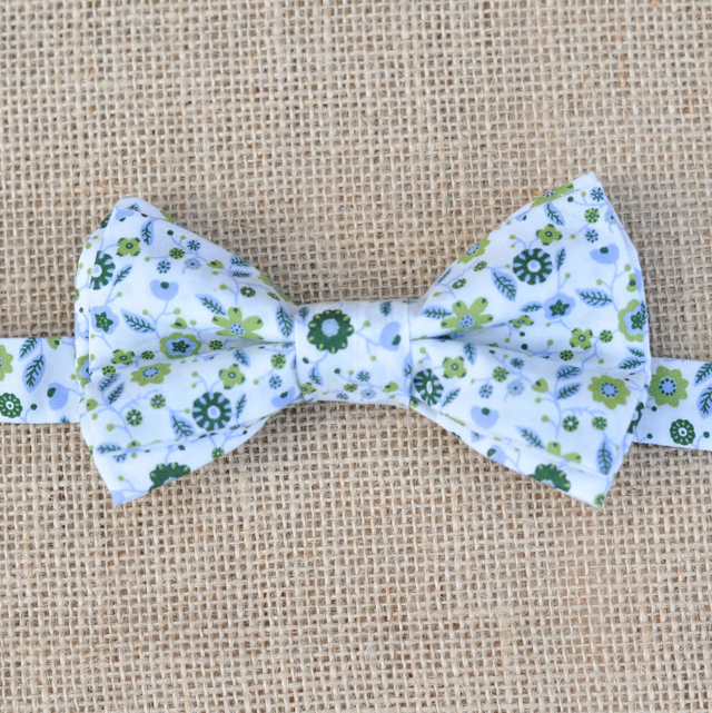 Ce nœud papillon aux motifs floraux de type Liberty est une véritable bouffée de fraîcheur. Ses teintes douces – blanc, bleu ciel, vert bouteille et anis – apportent de la lumière et une touche naturelle à votre tenue.