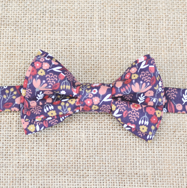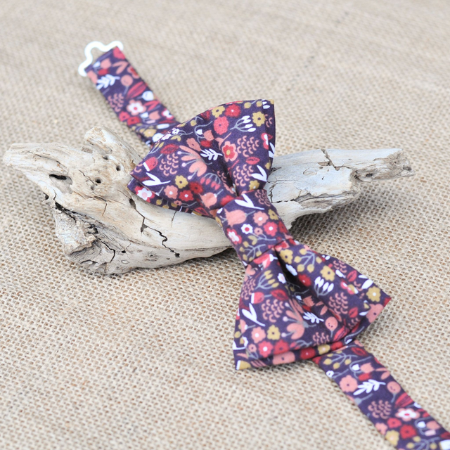 Ce nœud papillon aux teintes profondes et chaleureuses évoque la chaleur des matières brutes et la douceur des paysages naturels. Sur un fond terracotta, les motifs floraux se déploient en touches de framboise, de moutarde et de blanc.